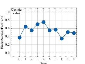 >>> # Example plotting multiple values >>> import torch >>> from torchmetrics.classification import BinaryAveragePrecision >>> metric = BinaryAveragePrecision() >>> values = [ ] >>> for _ in range(10): ... values.append(metric(torch.rand(20,), torch.randint(2, (20,)))) >>> fig_, ax_ = metric.plot(values)