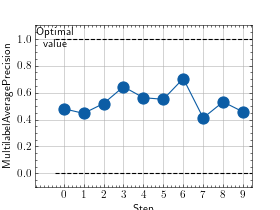 >>> # Example plotting multiple values >>> import torch >>> from torchmetrics.classification import MultilabelAveragePrecision >>> metric = MultilabelAveragePrecision(num_labels=3) >>> values = [ ] >>> for _ in range(10): ... values.append(metric(torch.rand(20,3), torch.randint(2, (20,3)))) >>> fig_, ax_ = metric.plot(values)