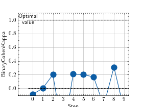 >>> from torch import rand, randint >>> # Example plotting multiple values >>> from torchmetrics.classification import BinaryCohenKappa >>> metric = BinaryCohenKappa() >>> values = [ ] >>> for _ in range(10): ... values.append(metric(rand(10), randint(2,(10,)))) >>> fig_, ax_ = metric.plot(values)
