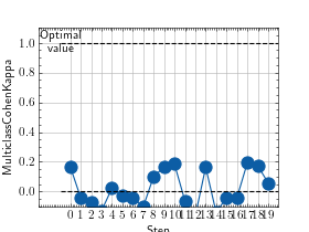 >>> from torch import randn, randint >>> # Example plotting a multiple values >>> from torchmetrics.classification import MulticlassCohenKappa >>> metric = MulticlassCohenKappa(num_classes=3) >>> values = [] >>> for _ in range(20): ... values.append(metric(randn(20,3).softmax(dim=-1), randint(3, (20,)))) >>> fig_, ax_ = metric.plot(values)