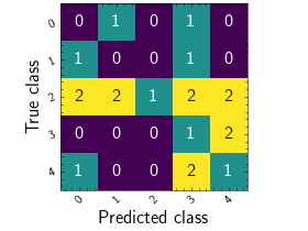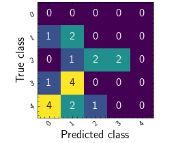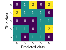 The confusion matrix \(C\) is constructed such that \(C_{i, j}\) is equal to the number of observations known to be in class \(i\) but predicted to be in class \(j\). Thus row indices of the confusion matrix correspond to the true class labels and column indices correspond to the predicted class labels.