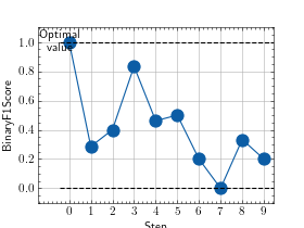 >>> from torch import rand, randint >>> # Example plotting multiple values >>> from torchmetrics.classification import BinaryF1Score >>> metric = BinaryF1Score() >>> values = [ ] >>> for _ in range(10): ... values.append(metric(rand(10), randint(2,(10,)))) >>> fig_, ax_ = metric.plot(values)