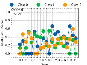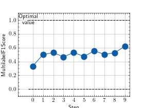 >>> from torch import rand, randint >>> # Example plotting multiple values >>> from torchmetrics.classification import MultilabelF1Score >>> metric = MultilabelF1Score(num_labels=3) >>> values = [ ] >>> for _ in range(10): ... values.append(metric(randint(2, (20, 3)), randint(2, (20, 3)))) >>> fig_, ax_ = metric.plot(values)