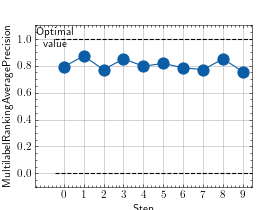 >>> from torch import rand, randint >>> # Example plotting multiple values >>> from torchmetrics.classification import MultilabelRankingAveragePrecision >>> metric = MultilabelRankingAveragePrecision(num_labels=3) >>> values = [ ] >>> for _ in range(10): ... values.append(metric(rand(20, 3), randint(2, (20, 3)))) >>> fig_, ax_ = metric.plot(values)